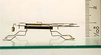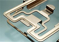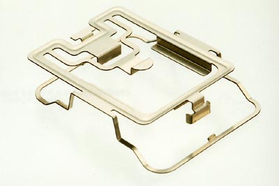 ードスロットは、まず平板の状態で絞り加工を施し、レーザー加工機で外形を切断している。これは製品の材料部が少なく、細いために、外形を先に切断するとビードによって歪みなどが生じるおそれがあるからである。次の曲げ加工は、そのほとんどがプレスブレーキで行われ、プレスブレーキが使えない部分は、一部、鋼板を重ねた型を起こして対応している。ちなみに型の製作にあたっては、製品の材質がSUSのバネ鋼のために、それよりも堅いリボン板を使用、レーザー加工機によってより精度の高い型作りを心がけている。