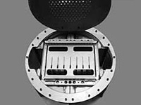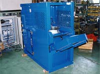 イナーシャーを大きくすると振動が出ないためにドラム全体の質量は20kg。毎分1200回転し、回転時の負荷は350G。 篭ホルダー、蓋、部品篭によって構成されている。部品篭は部品形状によって一品一様だ。このドラムを回転台に載せ、