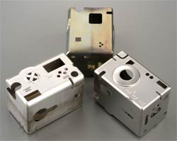 「新素材を対象にして簡易型による深絞り技術を開発し、高度化することを目的に社内テスト用としてスタートさせたのです」と語る堤 健児社長は、試作の新たな世界を拓くために若手技術者でスタッフを編成。トライ・アンド・エラーのなかからデータを積み重ねて技術の共有化をはかり、新工法の開発に成功したもの。金賞を受賞した『デジカメのケース本体』がその成果である。
