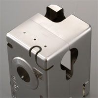 成形は、第一絞りでは2mmほど浅く絞ってスプリングバック量を調整し、次にきめ押ししながら直角度を修整する方法がとられている。その結果、コーナー部の内アールは1.5mmを実現し、絞り高さ45mmで口開きの公差は±0.02mm以内。二つの部品を突き合わせたときの段差が100分の2mm以上あると人間の指先で判別できるといわれているが、ケースの表裏を合わせた突き合わせ部を指でなぞってもまったく違和感がない。