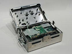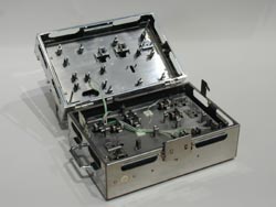 検査の仕組みは次のようになる。まずケースの上下にセンサーのついたプレス板をセットしたうえで被検査基板を下面のプレス板にセット。次いでケースの蓋を閉めてからケース上部のレバーを押し下げることで上下のセンサーが接触、導通した箇所が取り付け漏れということになる。導通した箇所は装置に接続されたパソコン画面で確認する。