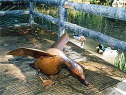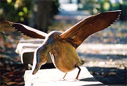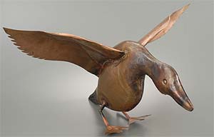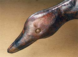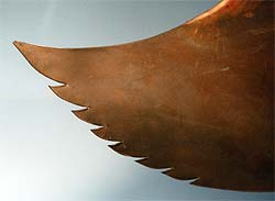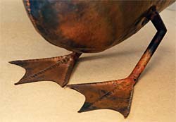 水鳥がまさに飛び立とうとするところを造形したものである。水鳥の写真を模写し、平図に展開してスタートした。素材は、銅のなかでも比較的軟らかい材質のC1100Pをつかい、すべて手づくり。バーナーで熱を加えながら、銅板をこつこつと叩き出して形状をつくりだしていった。最も留意したのが素材の伸び率だ。叩きすぎては割れが生じてしまう。伸びの程度を確認し、手になじませながらの作業となった。