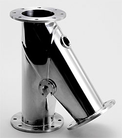 槽するサイロやタンクなどへ微粉末を高圧エアに乗せて輸送する際に使用する配管の切換装置である。輸送経路を二方向に切り換える弁機構を内部に持つ。食品、薬品、化学からエレクトロニクス、環境関連まで多様な業種で稼働する粉体プラントに組み込まれるものだ。粉体の総合エンジニアリング企業であるツカサ工業が"パウチェンジミドル"の商品名で開発(写真2)、シリンダーハンドルを上下すると、内部のフラップ弁が動いて経路を切り換える機構(写真3〜4)をとる。鋳物製からステンレス薄板構造に転換し8割以上の軽量化を実現した。