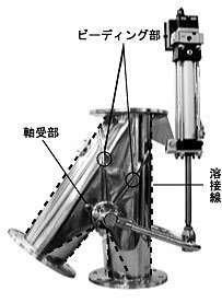 賞の対象となったのはシリンダーハンドルを外した本体部(写真1)。9mm厚のフランジ3枚と板厚1.5mmのステンレス薄板4部材、機械加工が施された軸受部で構成する。材質はともにステンレスSUS304。