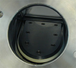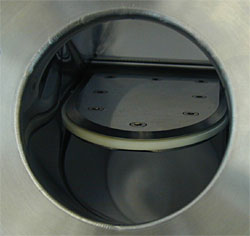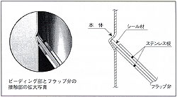 フラップ弁のステンレス板が本体にまず接触して、シール材に負担をかけずに高シール性を保持する機構となっている。高精度なビーディング形状が必要となる。