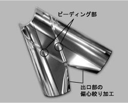 その実現のための第一のポイントとなるのが本体の展開。写真2に溶接線を示してあるが、製品を縦割りするように左右2部材、軸受部下の2部材、計4部材で構成する手法をとった。写真5が曲げ加工を施した片面の部材であるが、ここでポイントとなるのがフラップ弁先端のシール材を受けて気密性を保持する役割を持つビーディング部(図1)。ビーディング加工によって発生する、板の伸び縮みまで読んだ精緻な展開が不可欠となるためだ。当然、R曲げにも大きく影響する。溝幅が一定ではないビーディングが入ったブランク曲げだけに難加工となる。曲げ精度が製品精度を決める大きなファクターとなるだけにウレタンのゴム材を使い、スキルと高度な治具の工夫で要求された精度を維持させている。微粉末をスムーズに流入させるために、入口部を偏心の絞り出し加工にした(写真5〜6)のも工夫のひとつ。別途溶接構造にしていた入口部を一体構造にし、工数削減と円滑な内面を持つサニタリー性、美観性の確保をも実現する。
