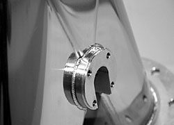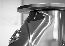 合部の溶接精度や歪みがシール性、サニタリー性に直接影響するだけに、創業者の航空機製造技術を基とした非鉄金属の溶接、精密板金の加工工場としてスタートした同社が培った高度の溶接技術が製品加工のベースとなっている。板厚が異なる本体とフランジ部の接合は、接合部のクリアランスが最小限になるよう前加工で十分に精度をつめたうえで、裏肉を出さずに隅肉溶接し(写真7)、本体の突き合わせ溶接も裏肉が均一に盛られるよう細かい工夫が随所になされた。後処理は行っていない。