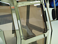 そのひとつが窓部のハーフ絞りだ(写真3)。積層型を使っているとのことであるが、ノウハウのため工法は公表できないとのこと。窓枠の強度が増すとともに扉との気密性が向上する効果があり、当技術は写真4の自社製品に昇華させている。ビード出し、コーナー部のR形状も簡易型で対応している。キャタピラーも細幅材を等ピッチで裏表正逆で連続曲げしたものだが、治具の工夫・開発によって加工したものだ。