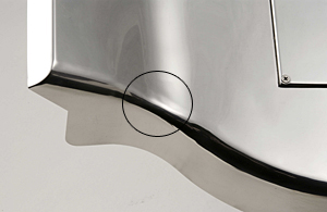 この異なるR形状の集中する部分が最も苦労した点です。特に展開はソフトを駆使しつつも、なかなか曲線の展開が難しく、手計算でデータをつくるなど、時間がかかりました。またもう1つの関門が曲げです。材質をステンレスに変えたことでひずみの問題が出てきます。接合面のすき間を少なくするためには高い曲げ精度が求められますが、これを可能にしたのが曲げ担当の社員(富ア真二ベンディング課主任=1級技能士)の技能でした。そして溶接とひずみ取りで、最終の仕上がりになっています。