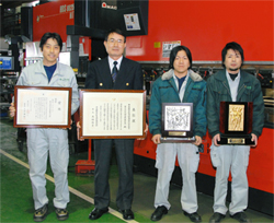 田名部 淳取締役営業部長と田名部秀世社長、富ア真二ベンディング課主任、塚本利彦NC加工製缶課長(左から)