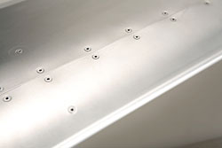設計は3次元CADにより勘合を確認し、試し加工を極力なくしています。また試作品でもあり、汎用金型のみで加工しました。さらに空気抵抗に対しては皿リベットを使用し、凹凸のない面を実現しました。この皿リベット加工による穴の位置決めの精度出しは、かなり苦労した点です。