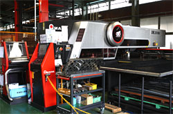 現在、発注元から送られてくる図面は、一部に紙図面が残っているが、ほとんどの場合はDXFデータ。これを2次元CAD/CAM AP100 2台で展開・CAM割り付けを行い、展開図データ、CAMデータをASIS100PCLサーバー(SDD)に記録する。それをもとにWinNESTが得意先別、製品別、材質・板厚、加工スケジュール単位ごとにネスティングを行い、パンチ・レーザ複合マシンEML-3510NT+ASR-48Mやパンチングマシン EM-2510NTといったブランク工程の加工マシンに受け渡して実加工を行う。現在、空調関係の納期は確定受注からおおよそ4日。同社では確定受注を1日先行して、ネスティングとブランク加工に着手している。4日よりも長い納期の場合、数量や納期など、注文変更が入りやすいため、歩留りの良いネスティングを行おうとすると注文変更に追われることになるが、SDDに保管されているリピート品の加工データを活用することでプログラム工程の負荷が大幅に軽減されている。 |