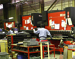 ▲5台のネットワーク対応型ベンディングマシンが並ぶ曲げ工程 |