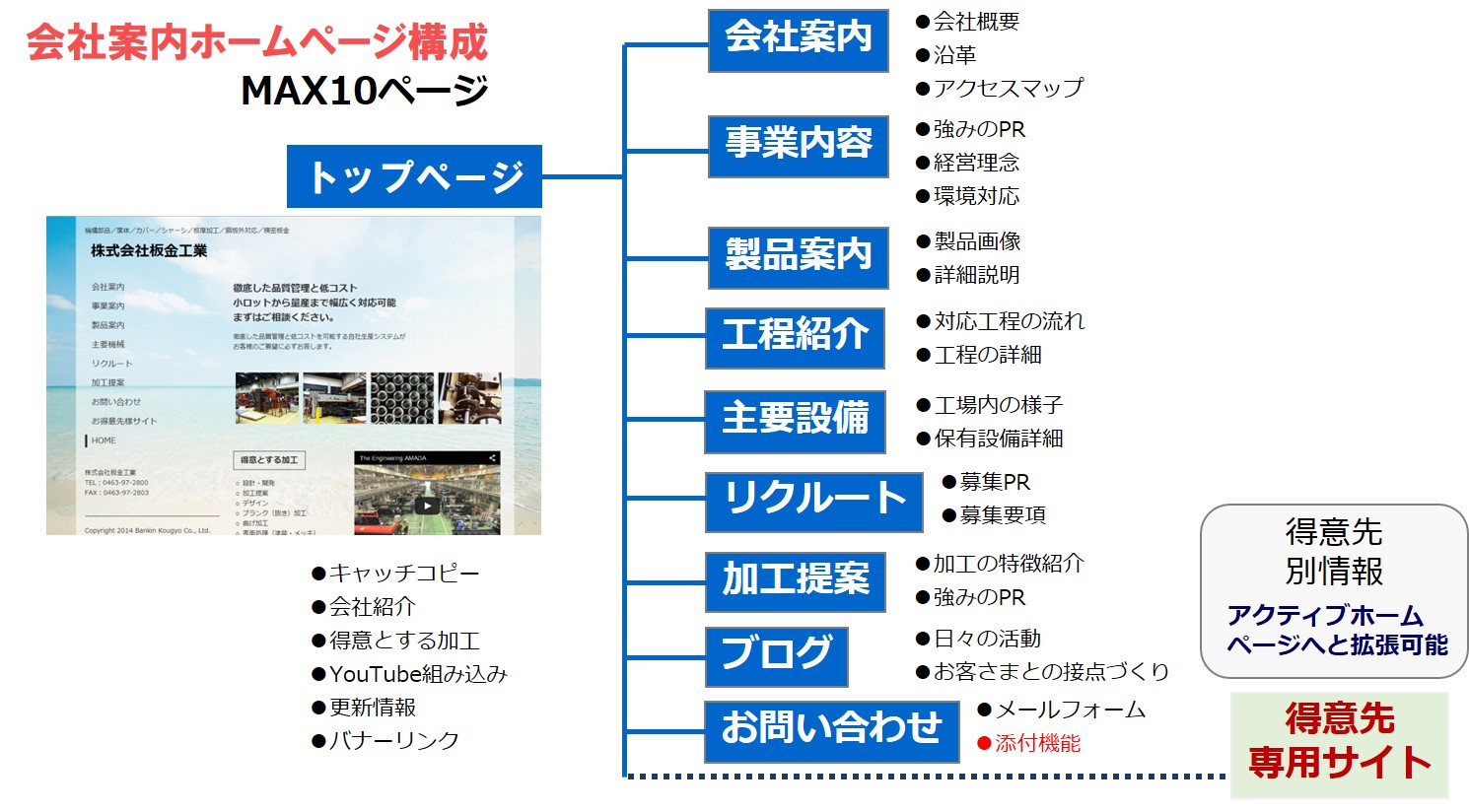 アマダのお客さまが取引先へのPRに必要な項目やページを定型でご用意しております。迷うことなくホームページが作成できます。