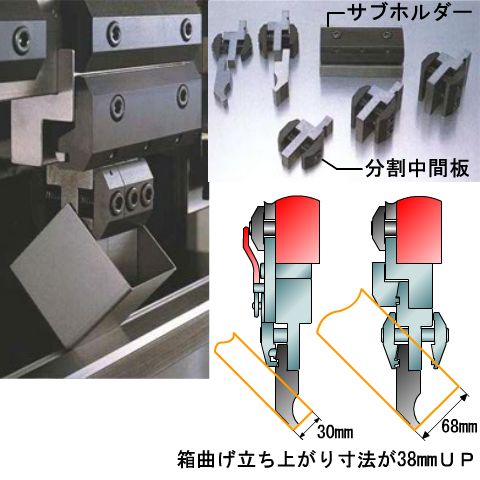 分割金型と中間板の組み合わせで、深曲げ・幅の狭い曲げ加工を可能にします