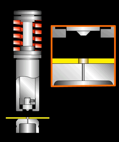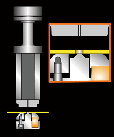 素材を皿形状に絞り加工したものです。 (右の写真) 材料の表面(下向き)と裏面(上向き)に加工する2種類があります。また、一体式とチップ式の2種類があり、チップ式は径の大きさに変更がある場合、チップの交換だけで対応できます。ただし、板厚と材質によって加工仕上がり状況が変化しますので、下穴寸法、ハイト寸法の微調整が必要となります。