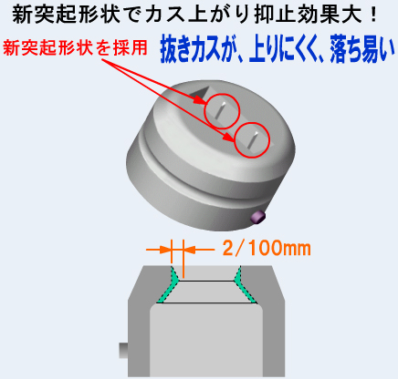 ダイの切刃に設けられた突起にカスを食付かせ、カス上がりを抑止します。