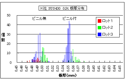 (ロット=ロール) | 下のグラフは、K社製SUS430(一般材)t0.5mmの3ロットの板厚分布です。 調査範囲内では、ロットごとの平均板厚の差は±1.5%でした。 ロット内の平均板厚の差は±3.5%でした。 |