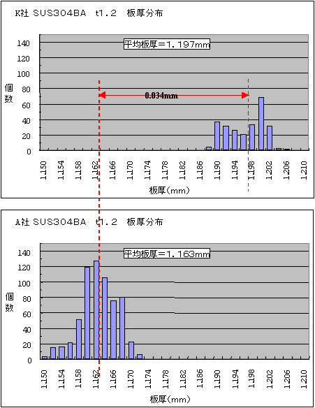 下のグラフは、SUS304BA(一般材)t1.2mmのK社とA社の板厚分布です。 K社の実板厚の平均は1.197mm、同A社は1.163mmで、平均板厚の差は0.034mm(約3%)の差でした。 |