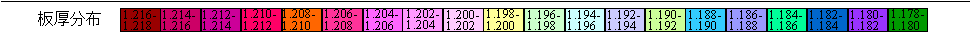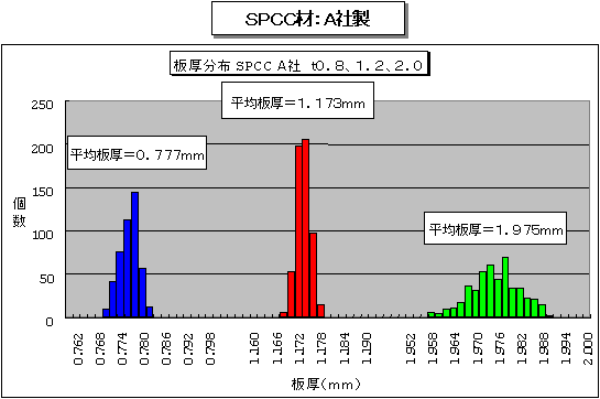 下のグラフは、A社製SPCC(一般材)の3種類の板厚の板厚分布です。 例えば、公称板厚1.2mmに対し、実板厚は1.166mmから1.178mmで、 バラツキ幅は0.012mm、平均板厚は1.173mmあり、 公称板厚との差は0.027mm(2%)でした。 調査範囲内では、公称板厚と実板厚平均板厚との差は0〜-4%でした。 |