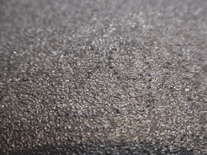 左写真は、通常のケガキ加工を行った時の仕上りです。真上から見ると認識できません。横にかざしてようやく見える程度です。アシストガス種はエアーも酸素も同程度です。又これ以上のパワーを入れますと溶融物が噴き上がります。 |
